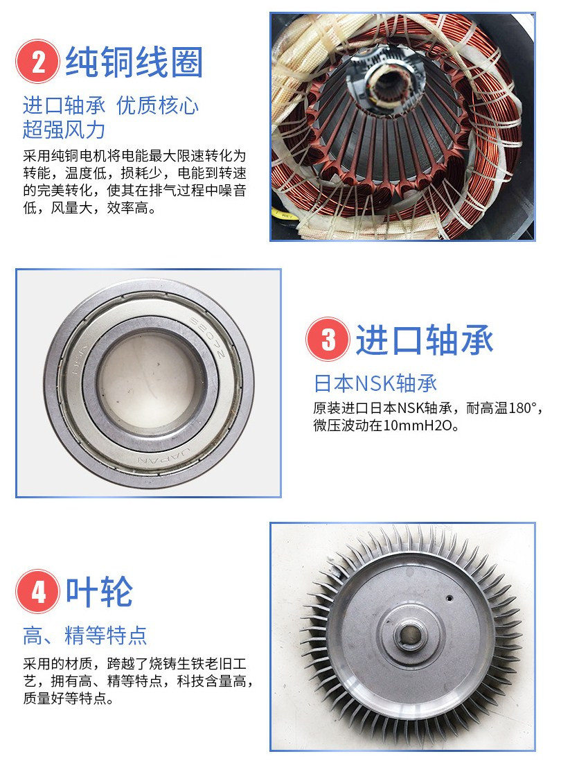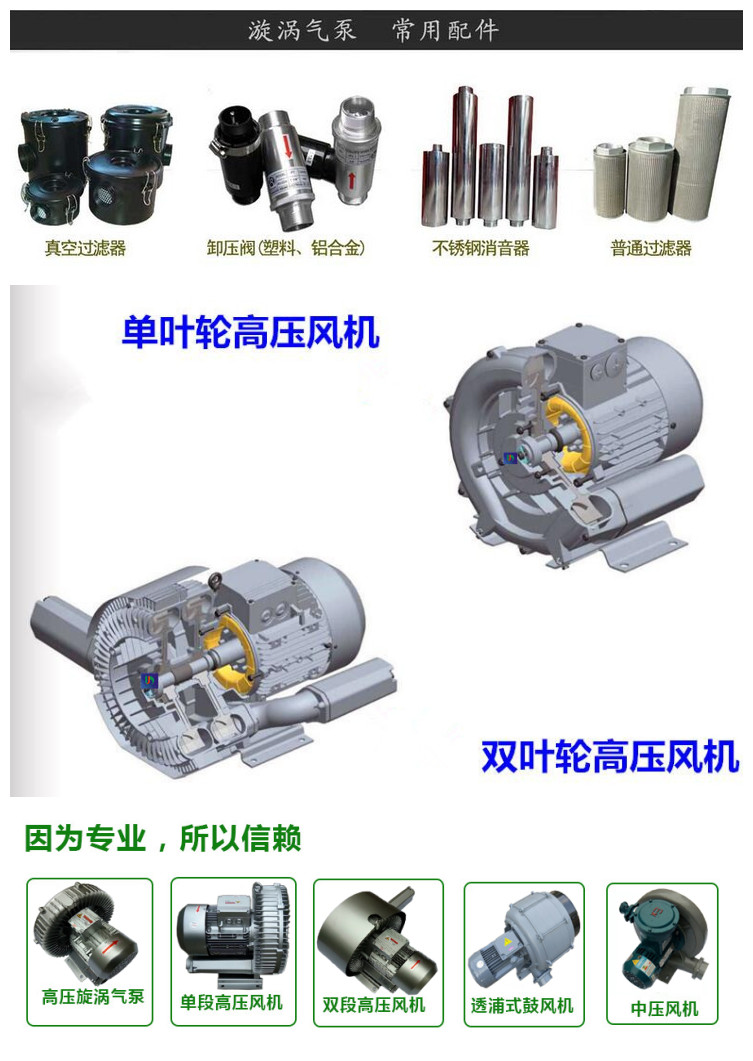 3、節能環保:高壓風機采用ADC12材料,與奔馳的轉鼓相同。它跨越了鑄鐵的舊工藝,葉輪與其他零件沒有任何接觸,無油、無污染,具有“高、精、輕”的特點,科技含量高、節能、低碳、高品質*優秀產品。