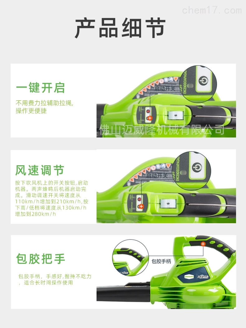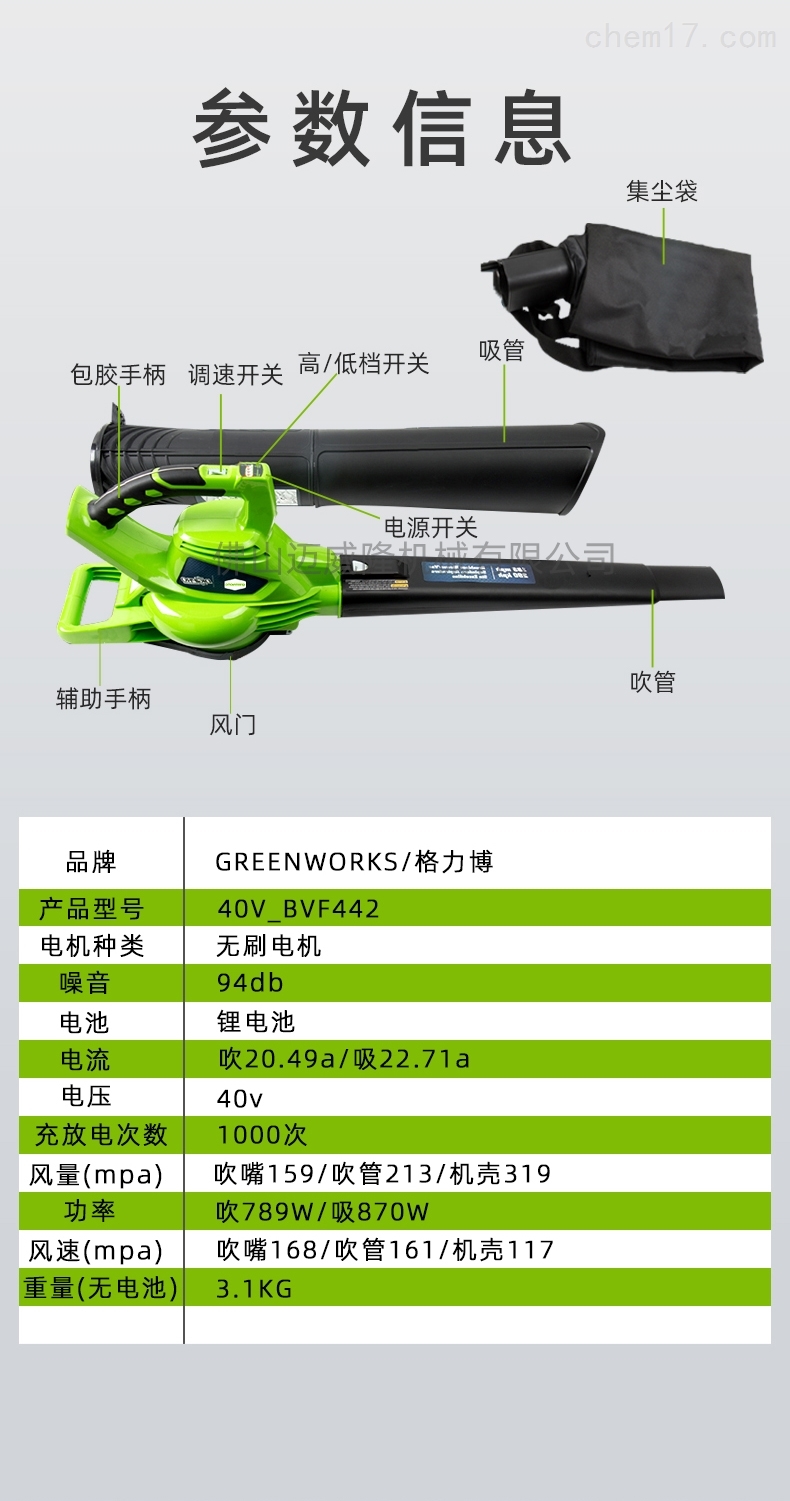 Glebe 40V bvf442便攜式鋰電池吹吸機產品參數:品牌:greenworks/Glebe產品型號:40V_bvf442電機類型:無刷電機噪音:94db電池:鋰電池電流:吹20.49a/吸收22.71a電壓:40V充放電次數:1000倍重量(無電池):3.1kg功率:吹789w/吸收870w風速(MPA):吹噴嘴168/吹管161/殼體177風量(MPA):吹管159/吹管213/殼體319