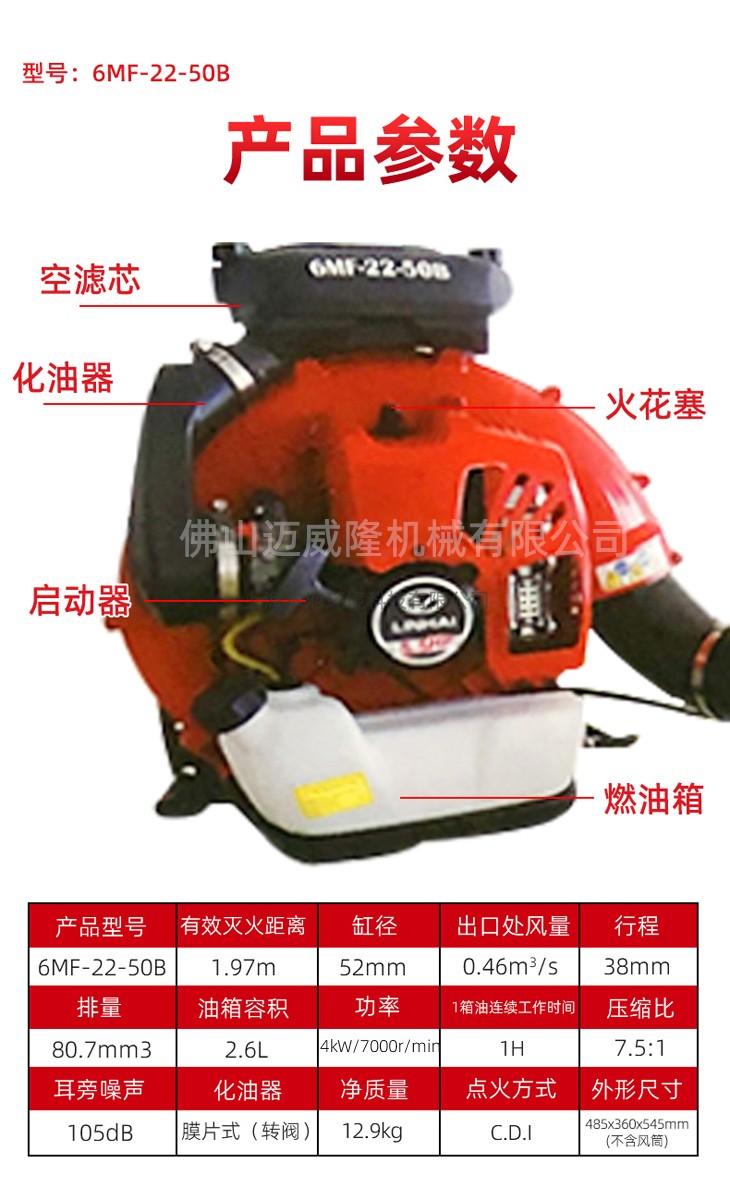 臨海臨海6mf-22-50b背負式風力滅火器森林消防救援風機二沖程除雪器產品參數:產品型號:6mf-22-50b有效滅火距離:1.97M氣缸直徑:52mm出口風量:0.46m3/s沖程:38mm排量:80.7mm3油箱容積:2.6L功率:4kw轉速:7000r/min油箱油連續工作時間:1H壓縮比:7.5:1耳側噪聲:105dB化油器:隔膜式(旋轉閥)凈質量:12.9kg點火方式:C.D.I外形尺寸:485x360x545mm(不含風道)